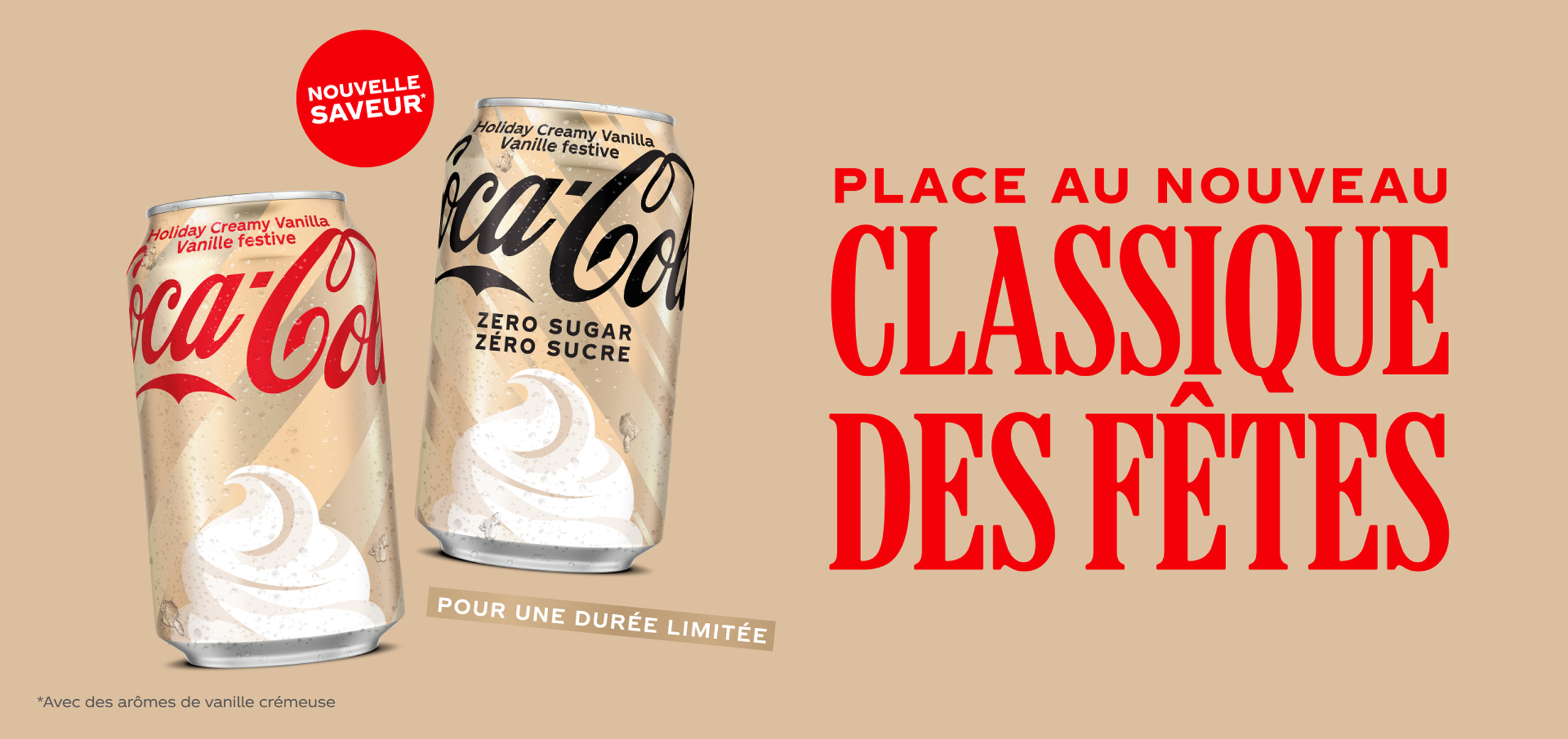 Rafraîchis tes fêtes avec cette saveur offerte pour une durée limitée! La boisson gazeuse Coca‑Cola Vanille festive offre le goût Coca‑Cola que tu aimes avec une saveur de vanille onctueuse et crémeuse. Ouvre une bouteille, verse-la sur des glaçons et laisse l’ambiance festive s’installer.