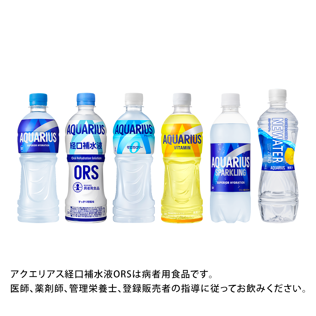 アクエリアスは水分とミネラル*を素早く補給し、渇いたカラダをサポートします。*ミネラルとはナトリウムの事です。