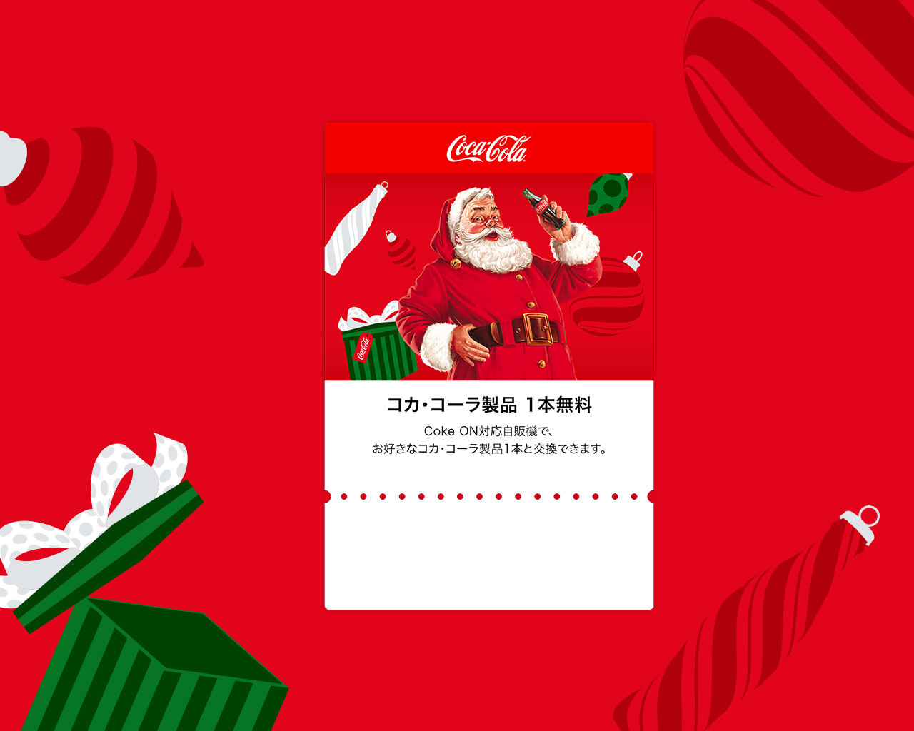 ただし、「コカ・コーラ」、「コカ・コーラ ゼロ」、「コカ・コーラ ゼロカフェイン」のPET製品(※350ml ラベルレスPETマルチパックは除く)、「コカ・コーラ」、「コカ・コーラ ゼロ」の350ml缶はクリスマスオーナメントラベルの限定デザインボトル(二次元コードはラベル側面に記載)が対象です。