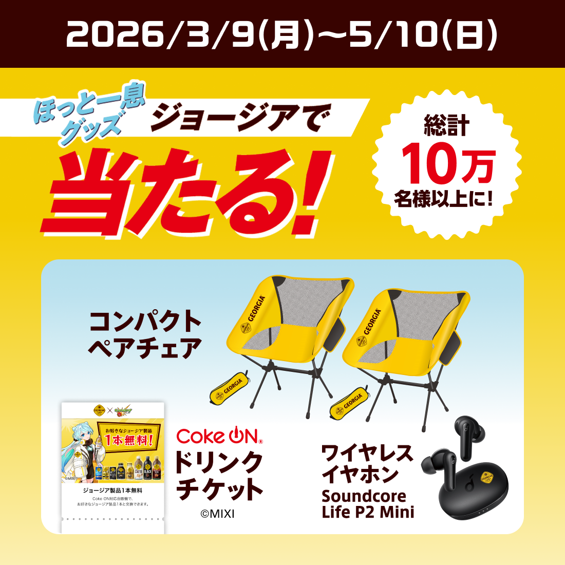 コンパクトペアチェアやワイヤレスイヤホンなど、ほっと一息グッズが総計10万名様以上に当たる!
