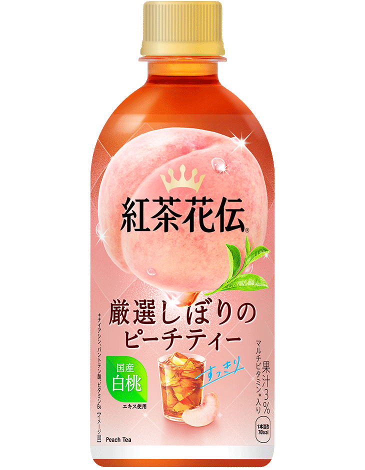 砂糖(国内製造)、もも果汁、紅茶、モモエキス/香料、ビタミンC、酸味料、クチナシ赤色素、甘味料(アセスルファムK、スクラロース)、パントテン酸Ca、ナイアシン、ビタミンB6