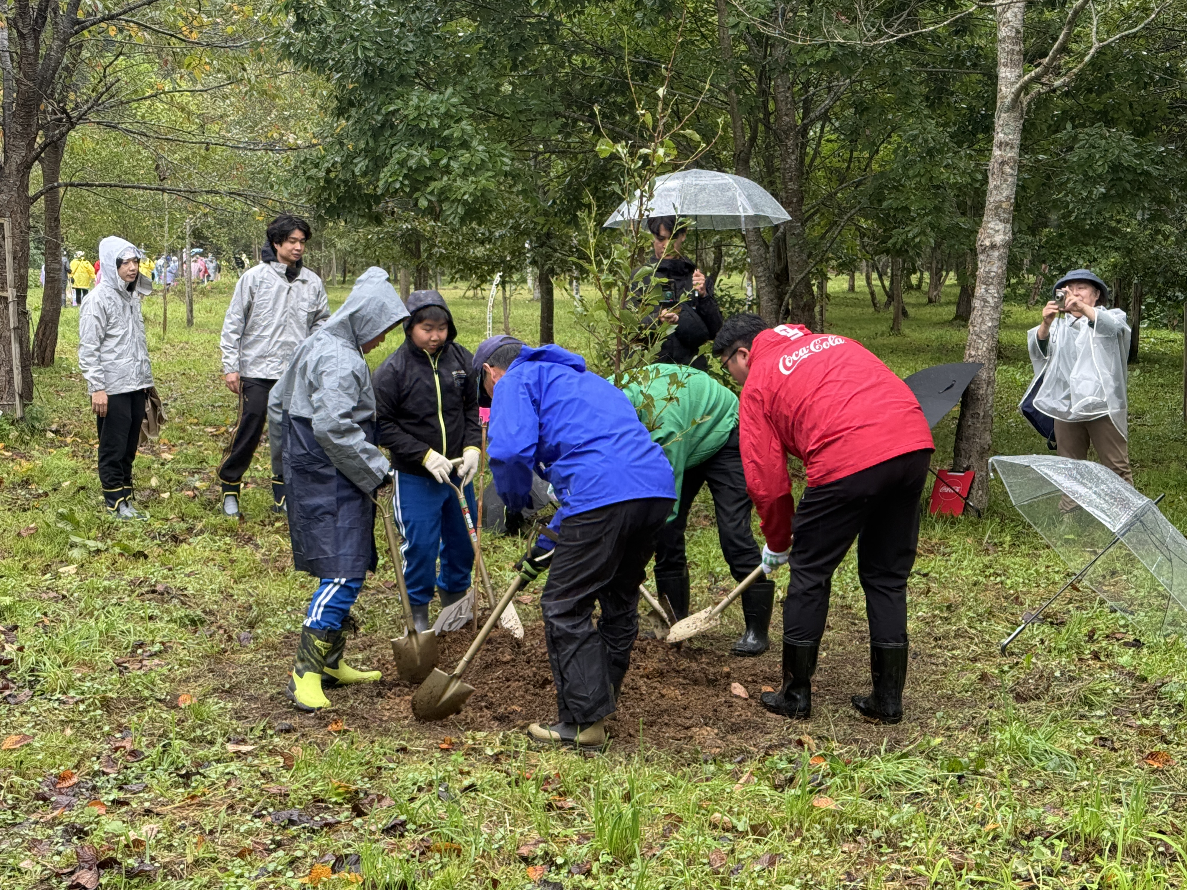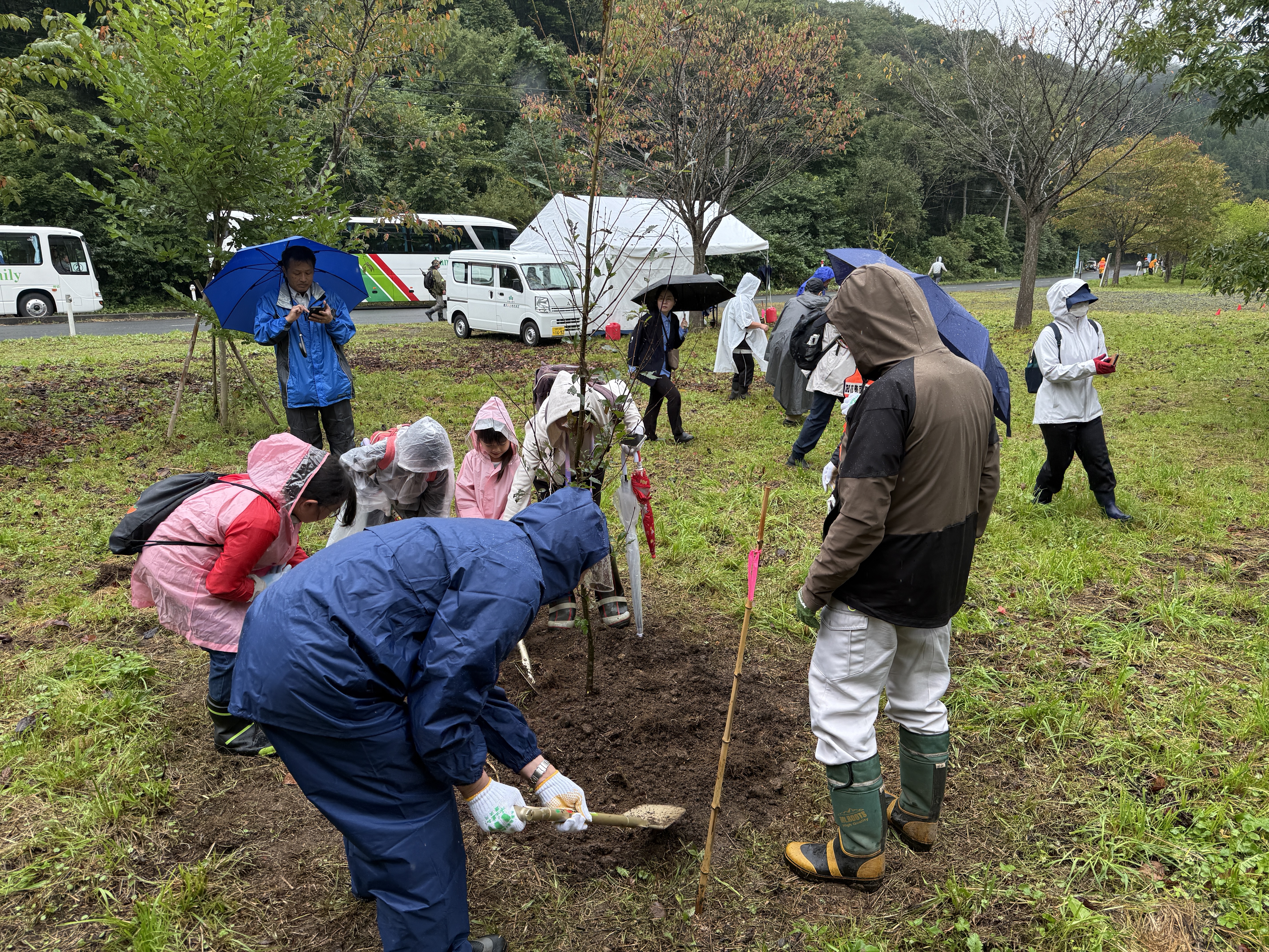 2025年の植樹祭は9月20日に開かれました。みちのくコカ·コーラボトリング社はもちろん、地域の子どもたちの他、主催者である豊沢川土地改良区や、総勢100名近くが参加し、シャベルを手に苗木を植えました。会場は、豊沢川の上流に位置する「水土里ネット豊沢川の森」です。流域に農業用水を安定供給する目的で作られた豊沢ダムをさらに上った、鬱蒼とした山に囲まれた壮大な場所です。