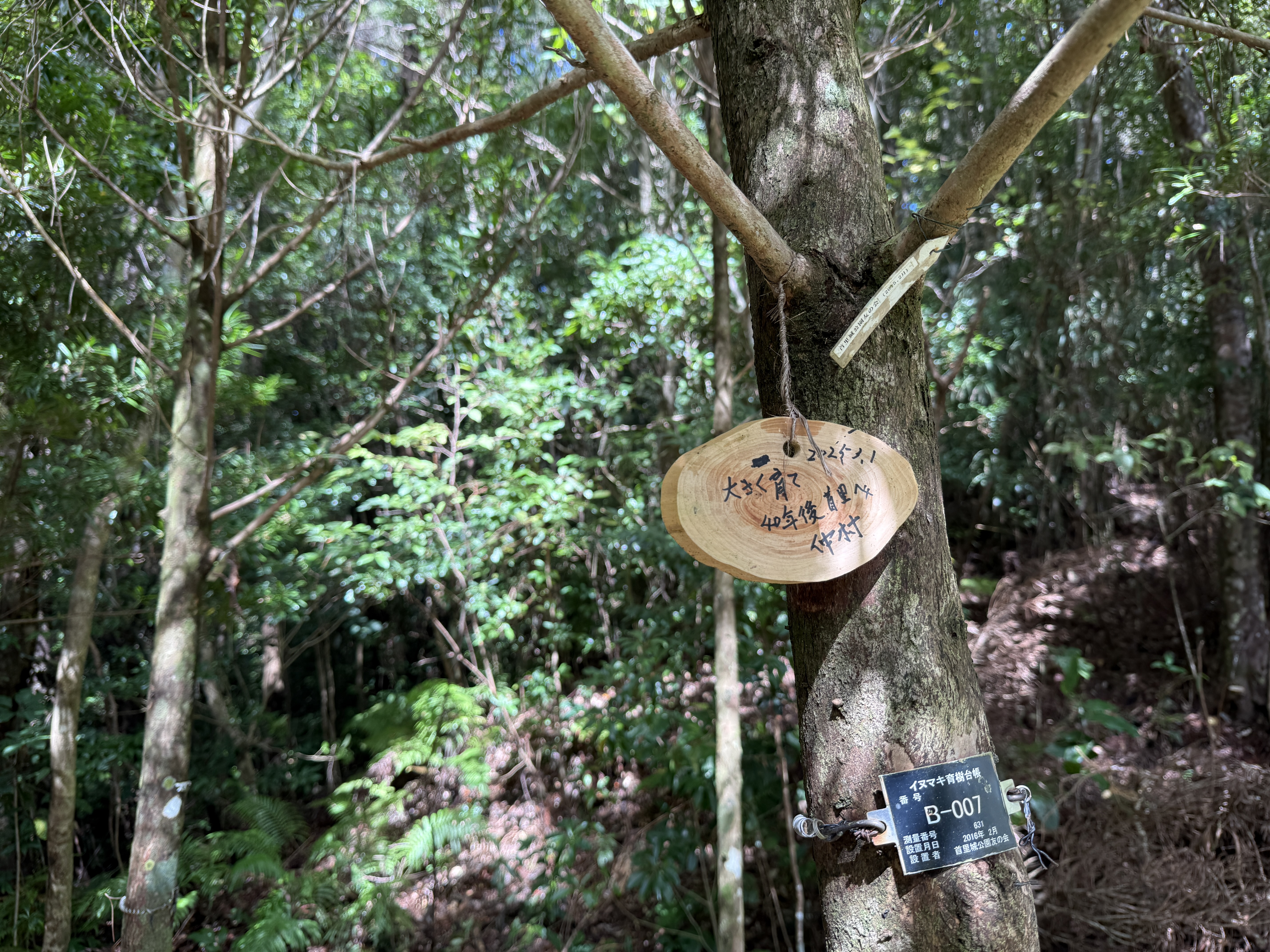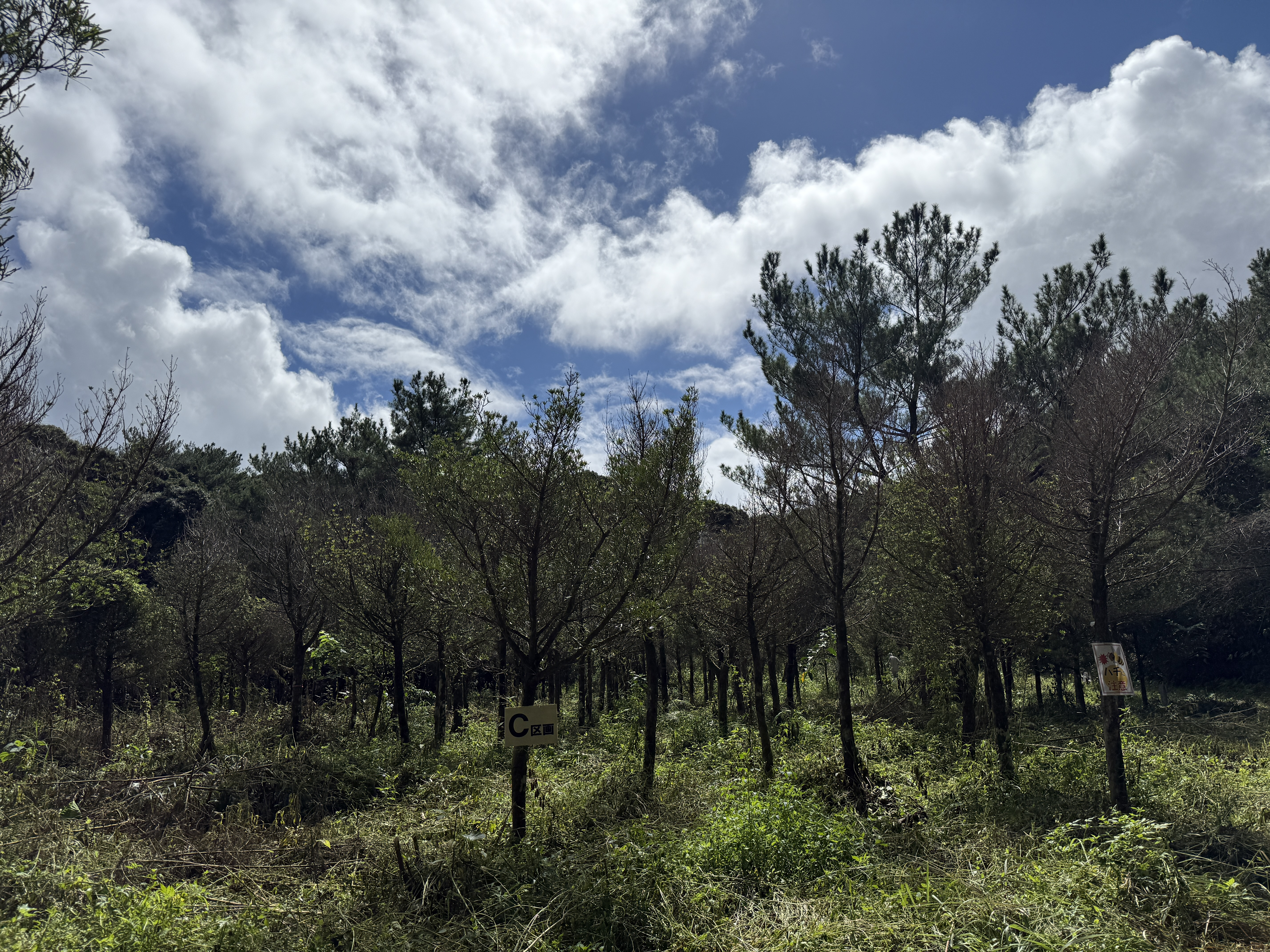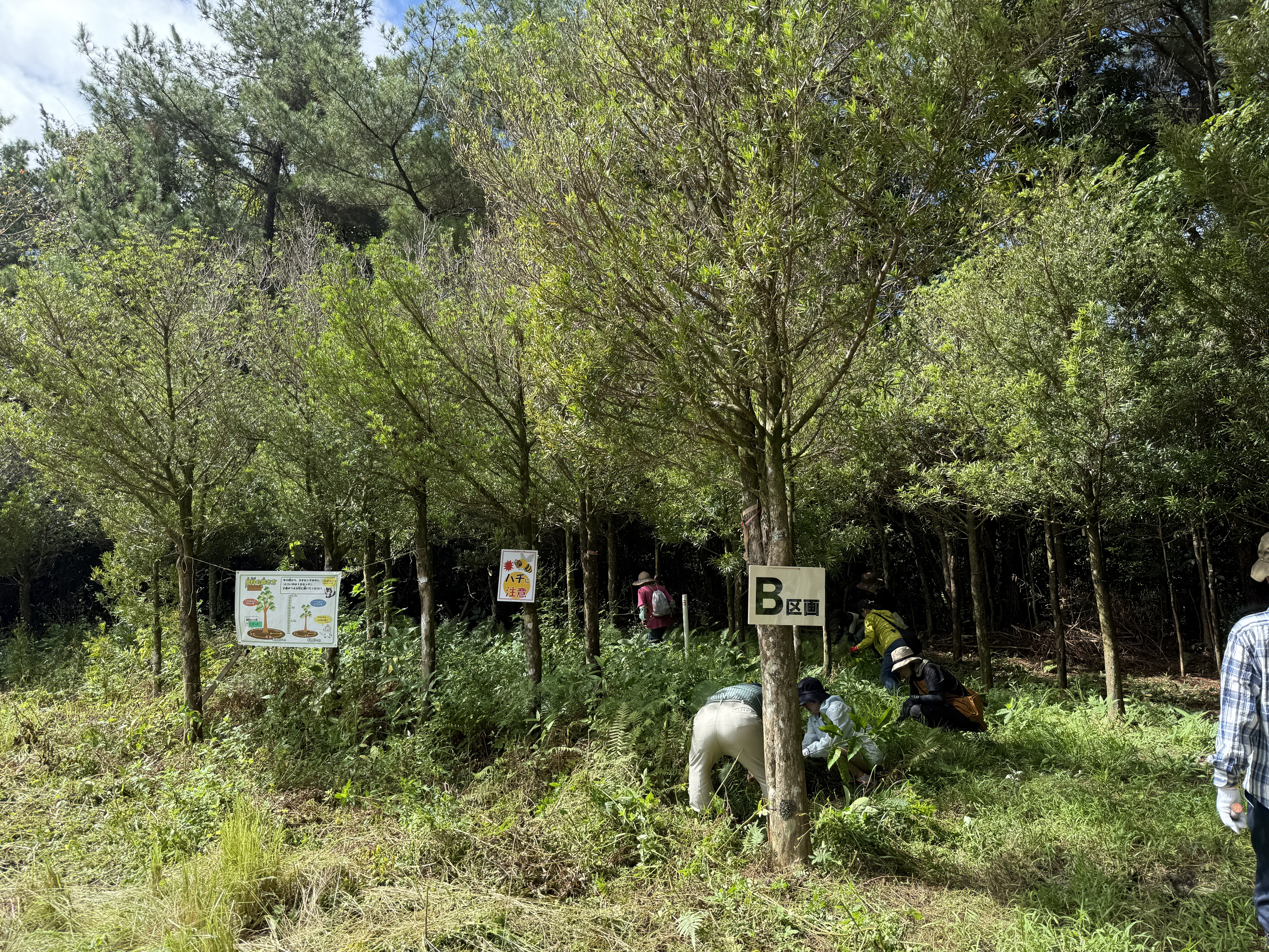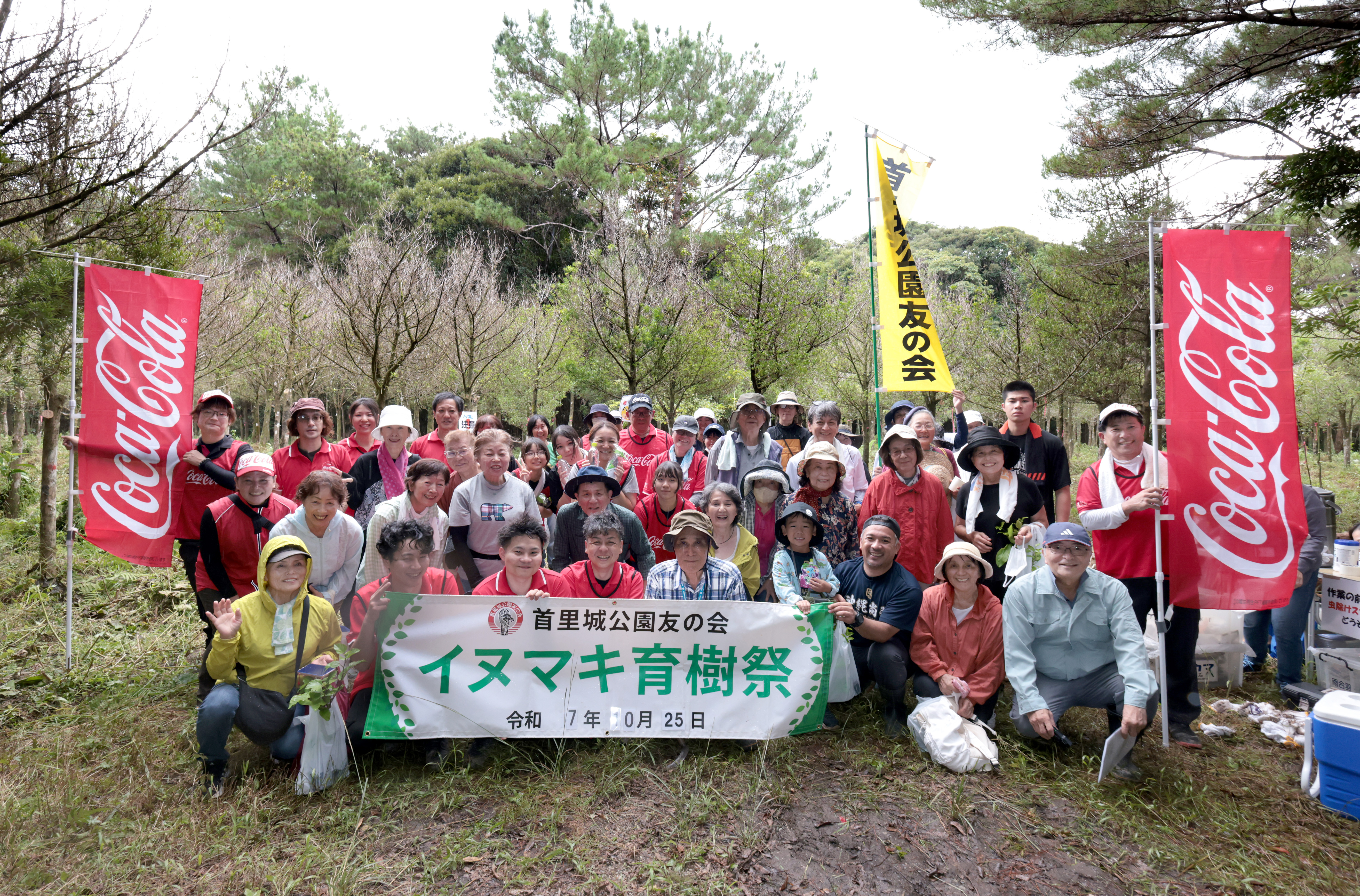 10月25日、国頭村・辺野喜ダム近くの県営林で秋の「イヌマキ育樹祭」が開かれ、首里城公園友の会の会員と、その活動を支援する沖縄コカ·コーラボトリング社の社員など総勢80名の市民ボランティアたちが参加しました。辺野喜ダム周辺はかつて赤土に覆われていた土地で石や砂利も多く、植物が育たない痩せた土地でした。この荒れた土地に緑を呼び戻そうとはじまったのが、首里城公園友の会イヌマキ育樹祭。活動をはじめてから30年ほどですが、今ではイヌマキが生き生きと育つ、緑豊かな土地に変化しています。